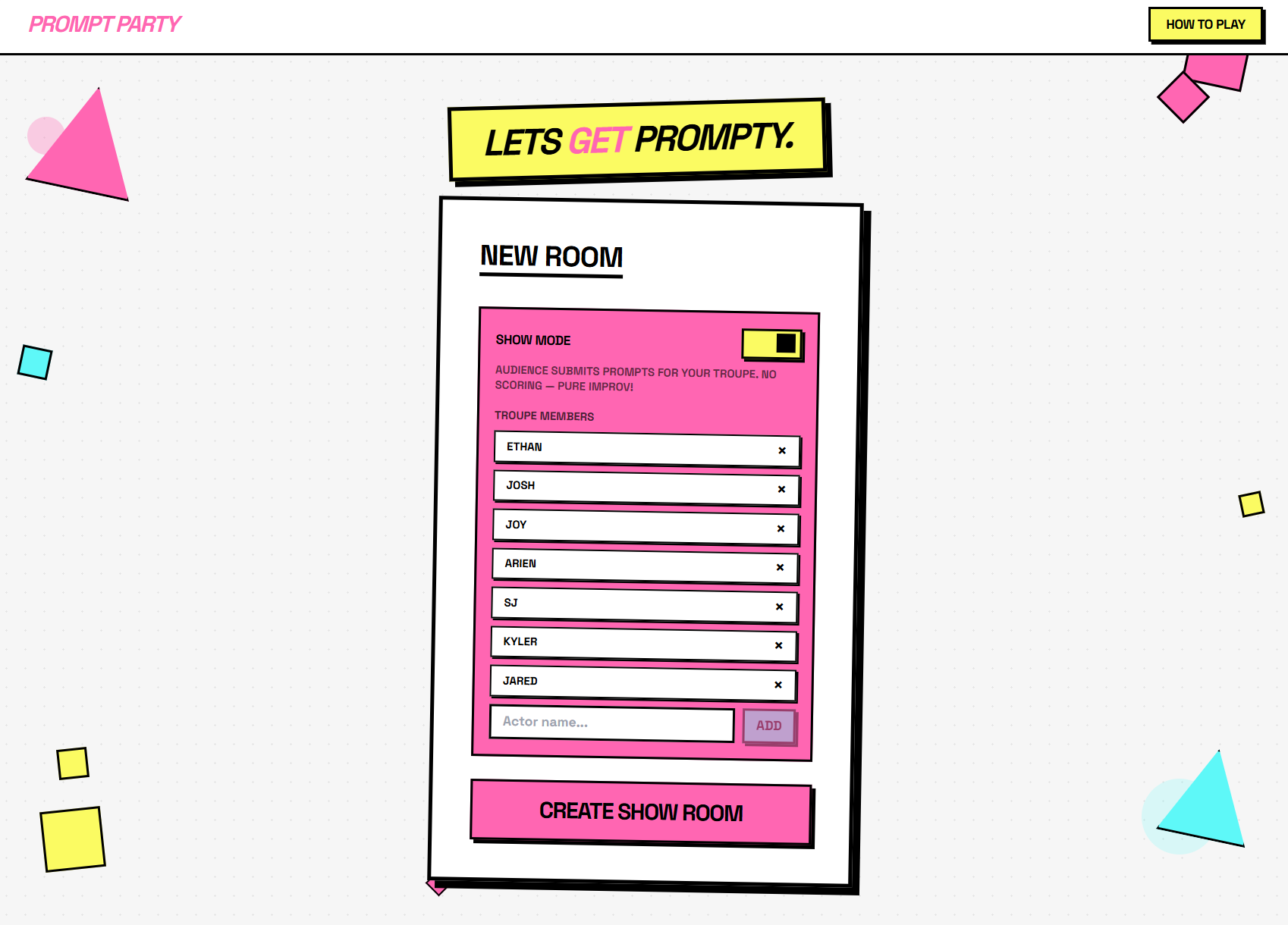 Running an improv show? Switch to Show Mode and let your audience submit prompts for your troupe to perform. Turn passive spectators into active participants.